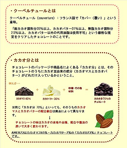 ビターな味わいが特徴的で、カカオ分は72%と高め。